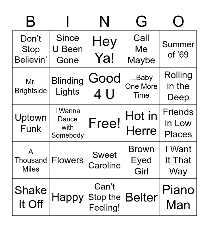 This bingo card has a free space and 28 words: I Want It That Way, No Scrubs, ...Baby One More Time, Belter, Mr. Brightside, Hey Ya!, Since U Been Gone, A Thousand Miles, Hot in Herre, Shake It Off, Uptown Funk, Call Me Maybe, Happy, Can’t Stop the Feeling!, Rolling in the Deep, Levitating, Flowers, Blinding Lights, Good 4 U, Sweet Caroline, Don’t Stop Believin’, Bohemian Rhapsody, Piano Man, I Wanna Dance with Somebody, Friends in Low Places, Brown Eyed Girl, Summer of ‘69 and Africa.