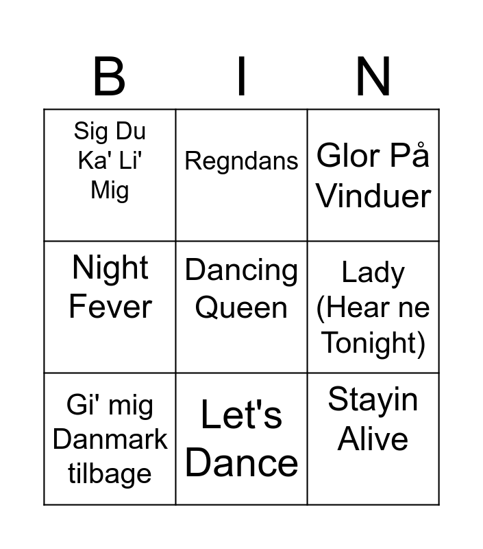 This bingo card has a free space and 33 words: De første kærester på månen, All my love, Den jeg elsker, elsker jeg, Hvor ska' vi sove i nat?, To mennesker på en strand, Tarzan Mama Mia, Regndans, Køb bananer, Sig Du Ka' Li' Mig, Jeg Vil La' Lyset Brænde, Stayin Alive, Night Fever, Groove Is In The Heart, Kvinde Min, Another One Bites The Dust, Kom Tilbage Nu, Get Down On It, Material Girl, Han får for lidt, Video Video, Det er mig der står herude og banker på, Pas på den knaldrøde gummibåd, Glor På Vinduer, Heksedansen, Vilde Kaniner, Born in the USA, Gi' mig Danmark tilbage, Let's Dance, Lady (Hear ne Tonight), All Night Long, Long Train Runnin', Summer of 69 and Solitudevej.