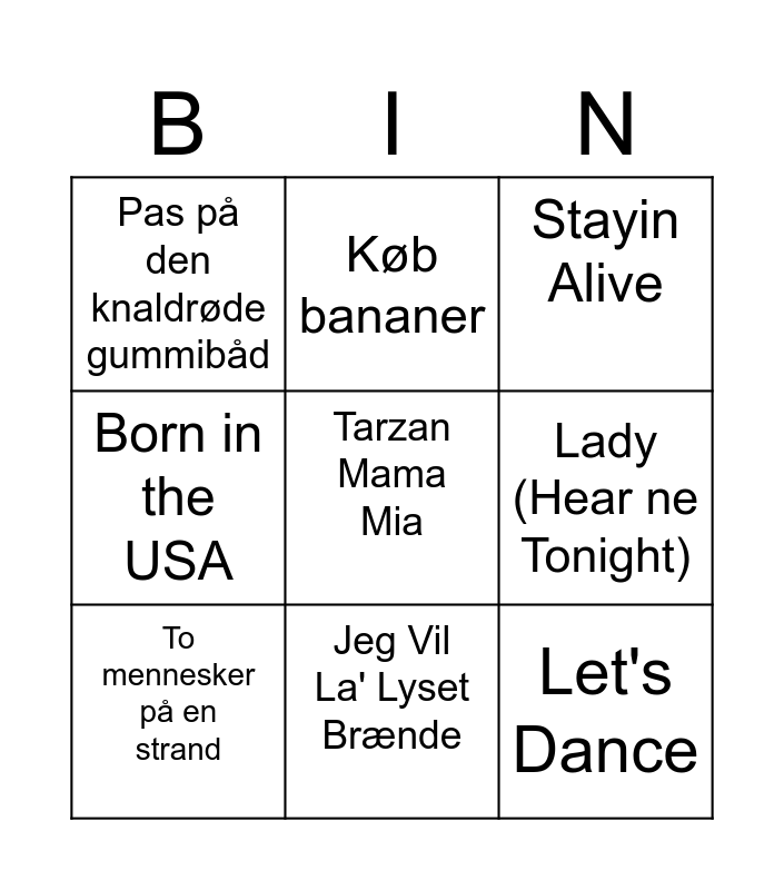 This bingo card has 34 words: De første kærester på månen, All my love, Den jeg elsker, elsker jeg, Hvor ska' vi sove i nat?, Dancing Queen, To mennesker på en strand, Tarzan Mama Mia, Regndans, Køb bananer, Sig Du Ka' Li' Mig, Jeg Vil La' Lyset Brænde, Stayin Alive, Night Fever, Groove Is In The Heart, Kvinde Min, Another One Bites The Dust, Kom Tilbage Nu, Get Down On It, Material Girl, Han får for lidt, Video Video, Det er mig der står herude og banker på, Pas på den knaldrøde gummibåd, Glor På Vinduer, Heksedansen, Vilde Kaniner, Born in the USA, Gi' mig Danmark tilbage, Let's Dance, Lady (Hear ne Tonight), All Night Long, Long Train Runnin', Summer of 69 and Solitudevej.