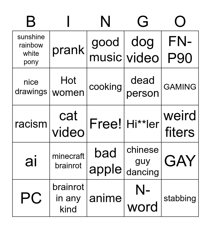 This bingo card has a free space and 24 words: minecraft brainrot, brainrot in any kind, cooking, PC, FN-P90, sunshine rainbow white pony, nice drawings, prank, Hi**ler, bad apple, dead person, racism, chinese guy dancing, GAY, Hot women, N-word, weird fiters, good music, GAMING, cat video, stabbing, ai, dog video and anime.