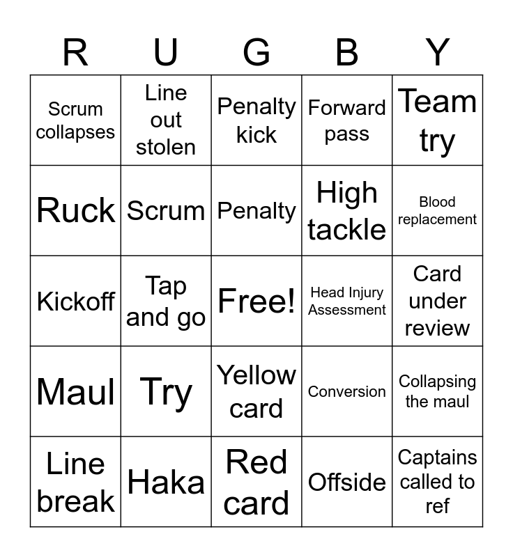 This bingo card has a free space and 34 words: Offload, Offside, Handoff, Knock on, Maul, Scrum, Team try, Line break, Line out stolen, Line out, Penalty, Penalty kick, Advantage, Try line defense, Head Injury Assessment, Blood replacement, Haka, Kickoff, Try, Conversion, Yellow card, TMO, Scrum collapses, Card under review, Red card, Captains called to ref, Forward pass, Tackle, High tackle, Ruck, Pick and go, Tap and go, Collapsing the maul and Time off / Time on.
