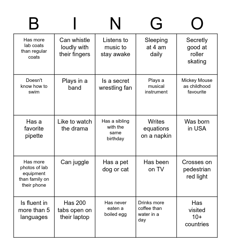 This bingo card has 25 words: Can juggle, Has never eaten a boiled egg, Is a secret wrestling fan, Is fluent in more than 5 languages, Secretly good at roller skating, Has more lab coats than regular coats, Doesn't know how to swim, Can whistle loudly with their fingers, Writes equations on a napkin, Has a pet dog or cat, Plays a musical instrument, Has a favorite pipette, Has been on TV, Crosses on pedestrian red light, Plays in a band, Has visited 10+ countries, Was born in USA, Listens to music to stay awake, Mickey Mouse as childhood favourite, Like to watch the drama, Has a sibling with the same birthday, Has 200 tabs open on their laptop, Has more photos of lab equipment than family on their phone, Sleeping at 4 am daily and Drinks more coffee than water in a day.