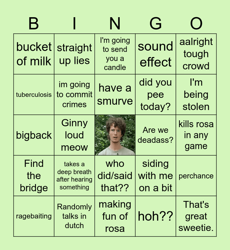 This bingo card has a free space and 24 words: takes a deep breath after hearing something, Randomly talks in dutch, have a smurve, ragebaiting, aalright tough crowd, bucket of milk, tuberculosis, straight up lies, Are we deadass?, who did/said that??, did you pee today?, bigback, siding with me on a bit, perchance, im going to commit crimes, hoh??, kills rosa in any game, I'm going to send you a candle, I'm being stolen, Ginny loud meow, That's great sweetie., Find the bridge, sound effect and making fun of rosa.