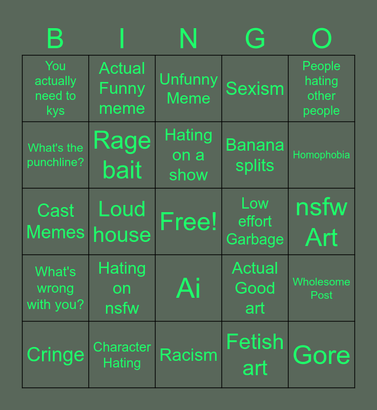 This bingo card has a free space and 24 words: Cringe, Hating on nsfw, Hating on a show, Fetish art, People hating other people, You actually need to kys, Actual Funny meme, Unfunny Meme, Low effort Garbage, nsfw Art, Cast Memes, Rage bait, Actual Good art, Wholesome Post, What's the punchline?, Character Hating, Racism, Sexism, Homophobia, What's wrong with you?, Loud house, Ai, Banana splits and Gore.