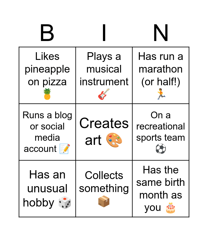 This bingo card has a free space and 8 words: On a recreational sports team ⚽, Has run a marathon (or half!) 🏃, Plays a musical instrument 🎸, Has an unusual hobby 🎲, Likes pineapple on pizza 🍍, Has the same birth month as you 🎂, Runs a blog or social media account 📝 and Collects something 📦.
