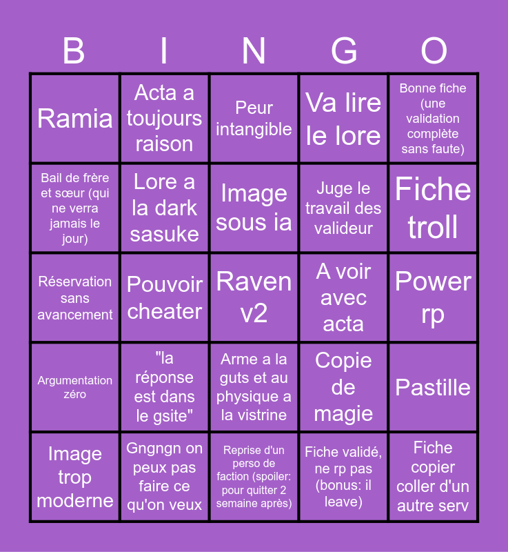 This bingo card has a free space and 29 words: Image trop moderne, Mot anglophone, Pouvoir cheater, Usage des pouvoirs par tours, Ramia, Peur intangible, Lore a la dark sasuke, "la réponse est dans le gsite", A voir avec acta, Gngngn on peux pas faire ce qu'on veux, Power rp, Fiche copier coller d'un autre serv, Reprise d'un perso de faction (spoiler: pour quitter 2 semaine après), Fiche validé, ne rp pas (bonus: il leave), Fiche troll, PNJ random, Arme a la guts et au physique a la vistrine, Argumentation zéro, Bonne fiche (une validation complète sans faute), Réservation sans avancement, Copie de magie, Copie d'un perso d'anime, Juge le travail des valideur, Bail de frère et sœur (qui ne verra jamais le jour), Va lire le lore, Acta a toujours raison, Pastille, Image sous ia and "Va faire ton boulot".
