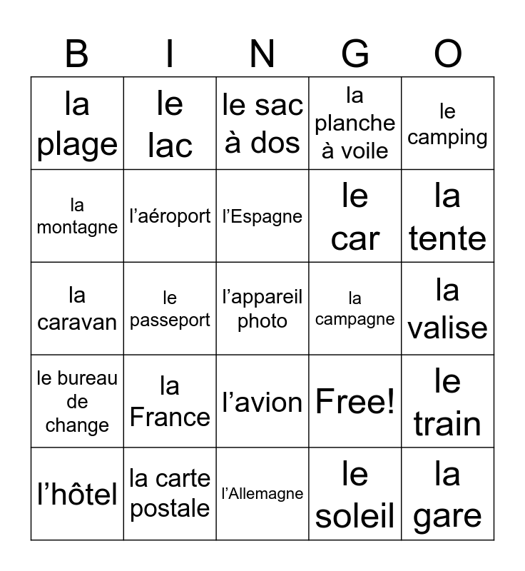 This bingo card has 25 words: la France, l’Allemagne, l’Espagne, l’hôtel, le camping, la plage, la montagne, le lac, la campagne, l’avion, le car, la caravan, Free!, le train, l’aéroport, la gare, la valise, le sac à dos, la tente, le passeport, l’appareil photo, la carte postale, le bureau de change, la planche à voile and le soleil.