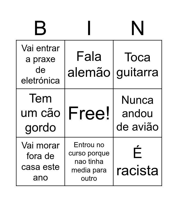 This bingo card has a free space and 18 words: Entrou no curso como 1ª opção, Tem irmão gémeo, Toca guitarra, Vai entrar a praxe de eletrónica, Obrigado a estar aqui, Tem um cão gordo, Tem carta de condução, Fala alemão, Entrou no curso porque nao tinha media para outro, Queria ser astronauta em criança, Vai entrar para o núcleo, É racista, Partiu os dentes em criança, Nunca andou de avião, Vai morar fora de casa este ano, É migrante, Prefere pipocas salgadas and Já apanhou shock elétrico.
