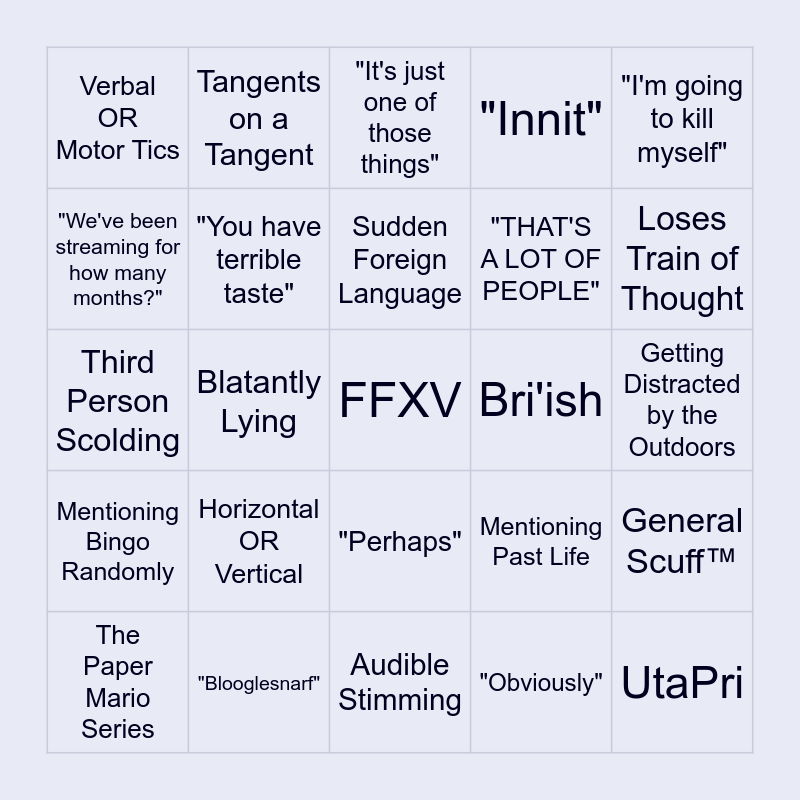 This bingo card has a free space and 44 words: Love and Deepspace, UtaPri, CROWN PRINCE DIMITRI ALEXANDRE BLAIDDYD OF THE HOLY KINGDOM OF FAERGHUS, The Paper Mario Series, "Normal™", "Obviously", "It's just one of those things", "When I lived in Japan", "I'm going to kill myself", "Blooglesnarf", "Innit", Bri'ish, "Perhaps", Horizontal OR Vertical, Hedging with "I think", Audible Stimming, Yawning, Third Person Scolding, 🙂↕️, Loses Train of Thought, Tangents on a Tangent, Babbling When Speaking, Swearing as a Filler Word, Verbal OR Motor Tics, Hallucinating Sounds OR Sights, Getting Distracted by the Outdoors, Model Breaks, "Let's end stream" ↓ Mad Yapping™, Mentioning Past Life, Mentioning Bingo Randomly, Comments on Voice, General Scuff™, "Embarrassing", Bulbasaur, Blatantly Lying, "Definitely", "i'm FINE", Disproportionate Malding, Sudden Foreign Language, "We've been streaming for how many months?", "THAT'S A LOT OF PEOPLE", "GET A HOBBY", "You have terrible taste" and "Bonkers".