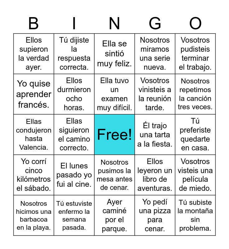 This bingo card has a free space and 24 words: El lunes pasado yo fui al cine., Tú estuviste enfermo la semana pasada., Ella tuvo un examen muy difícil., Nosotros hicimos una barbacoa en la playa., Vosotros pudisteis terminar el trabajo., Ellos supieron la verdad ayer., Yo quise aprender francés., Tú dijiste la respuesta correcta., Él trajo una tarta a la fiesta., Nosotros pusimos la mesa antes de cenar., Vosotros vinisteis a la reunión tarde., Ellas condujeron hasta Valencia., Ellos leyeron un libro de aventuras., Vosotros visteis una película de miedo., Ellos durmieron ocho horas., Yo pedí una pizza para cenar., Tú preferiste quedarte en casa., Ella se sintió muy feliz., Nosotros repetimos la canción tres veces., Ellas siguieron el camino correcto., Tú subiste la montaña sin problema., Yo corrí cinco kilómetros el sábado., Nosotros miramos una serie nueva. and Ayer caminé por el parque..