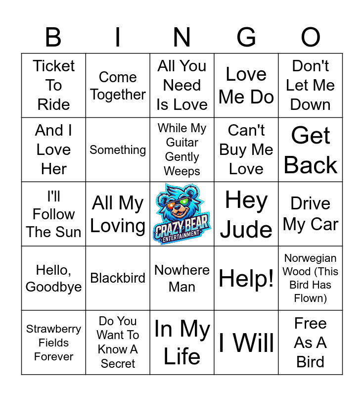 This bingo card has a free space and 50 words: Let It Be, Free As A Bird, Here Comes The Sun, In My Life, Blackbird, Yesterday, Come Together, Twist And Shout, And I Love Her, Ob-La-Di, Ob-La-Da, Something, Love Me Do, Norwegian Wood (This Bird Has Flown), Help!, Here, There And Everywhere, I Want To Hold Your Hand, While My Guitar Gently Weeps, Hey Jude, A Hard Day's Night, Don't Let Me Down, All My Loving, I Will, Ticket To Ride, Can't Buy Me Love, Eleanor Rigby, Golden Slumbers, Get Back, You've Got To Hide Your Love Away, All You Need Is Love, Nowhere Man, I Saw Her Standing There, The Long And Winding Road, If I Fell, Michelle, Do You Want To Know A Secret, Across The Universe, Penny Lane, Day Tripper, Octopus's Garden, Drive My Car, Till There Was You, She Loves You, With A Little Help From My Friends, Girl, Strawberry Fields Forever, I'll Follow The Sun, Lucy In The Sky With Diamonds, For No One, Hello, Goodbye and Now And Then.