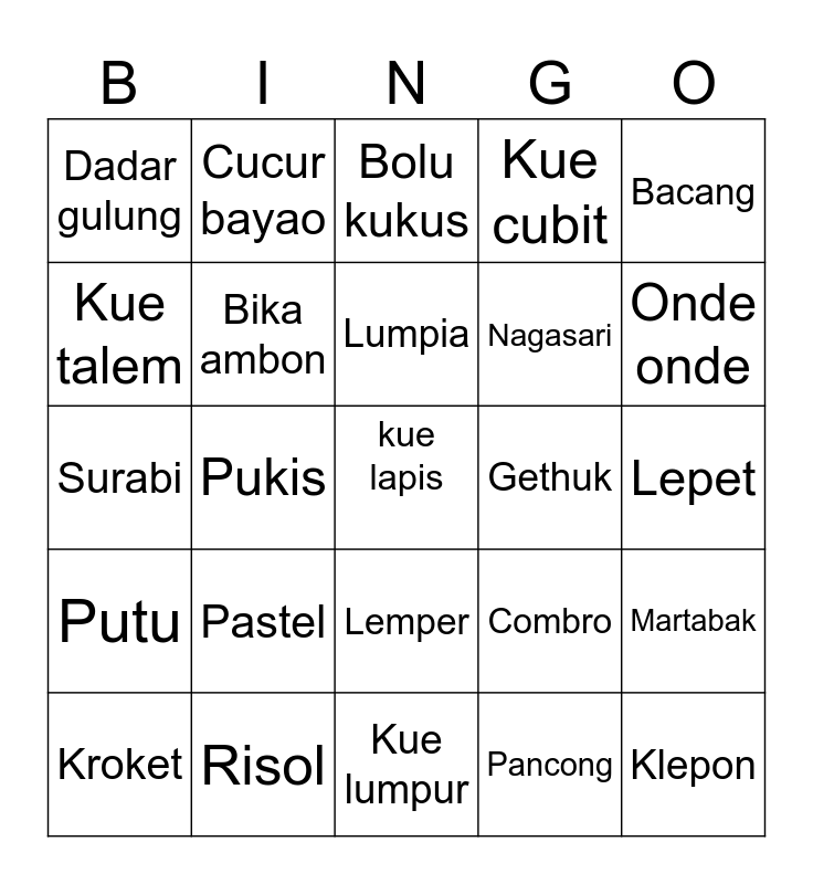 This bingo card has a free space and 24 words: Pastel, Risol, Lumpia, Kroket, Bacang, Dadar gulung, Kue talem, Cucur bayao, Gethuk, Lemper, Nagasari, Surabi, Combro, Martabak, Bika ambon, Pancong, Lepet, Bolu kukus, Onde onde, Pukis, Klepon, Putu, Kue cubit and Kue lumpur.