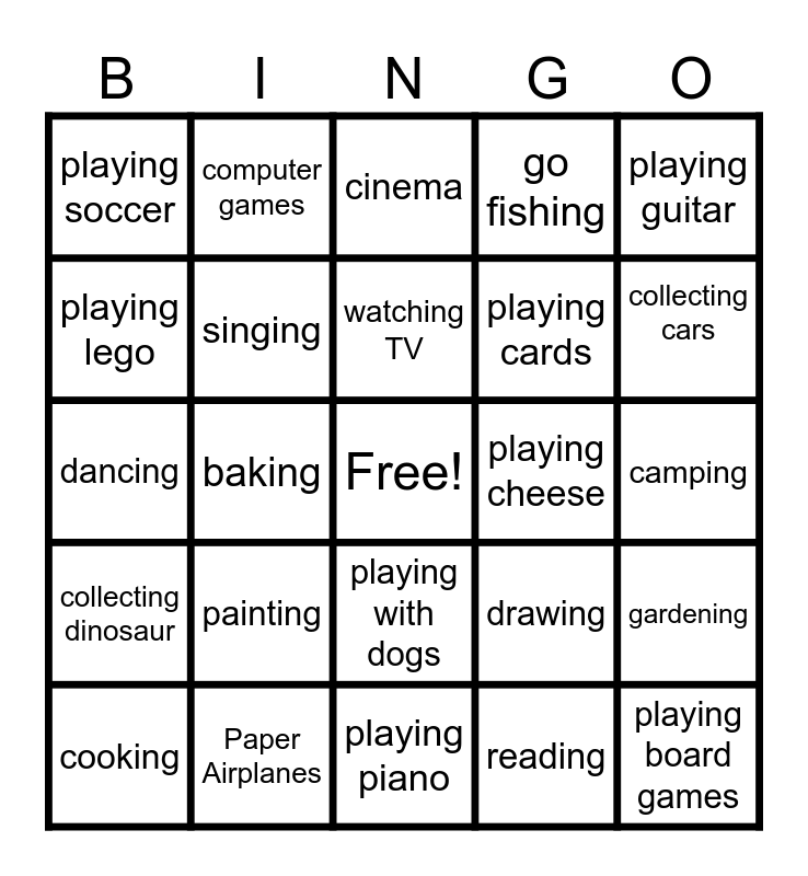 This bingo card has a free space and 24 words: cooking, painting, watching TV, reading, playing guitar, playing soccer, computer games, cinema, playing cheese, camping, dancing, singing, drawing, gardening, playing lego, Paper Airplanes, playing piano, go fishing, collecting cars, collecting dinosaur, baking, playing with dogs, playing cards and playing board games.