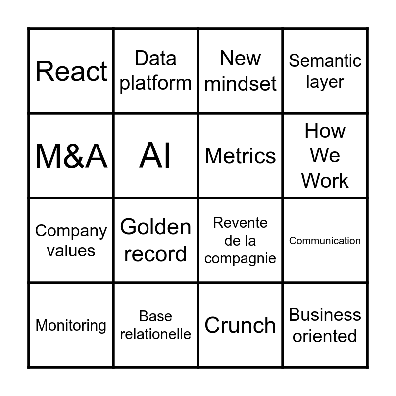 This bingo card has 28 words: Free!, Talk to the data, Company values, MDM, AI, New mindset, Data platform, Business oriented, Base relationelle, Profitable, Revente de la compagnie, Semantic layer, Power BI, Morceau de robot, Golden record, Piece of technology, People first, Metrics, How We Work, Ruby on Rails, React, Deutsche Bank, Monitoring, Communication, Crunch, Vision produit, M&A and Code review.