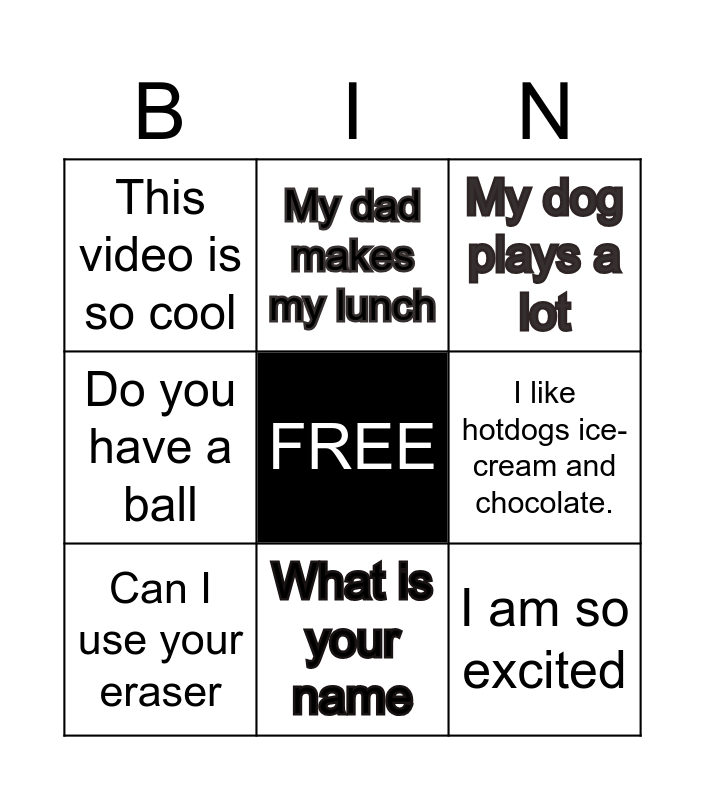 This bingo card has a free space and 11 words: I love my sister, What is your name, I am so excited, Can I use your eraser, My dad makes my lunch, My dog plays a lot, I like hotdogs ice-cream and chocolate., Why does it rain, Do you have a ball, This video is so cool and That hurt.