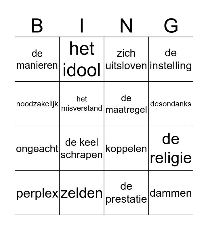 This bingo card has 16 words: zelden, de religie, zich uitsloven, de manieren, ongeacht, het idool, koppelen, de prestatie, noodzakelijk, het misverstand, perplex, de instelling, de keel schrapen, desondanks, de maatregel and dammen.