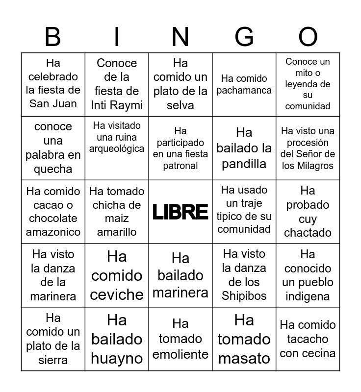 This bingo card has a free space and 24 words: Ha comido ceviche, Ha bailado huayno, Ha participado en una fiesta patronal, Ha comido un plato de la sierra, Conoce un mito o leyenda de su comunidad, Ha celebrado la fiesta de San Juan, conoce una palabra en quecha, Conoce de la fiesta de Inti Raymi, Ha usado un traje tipico de su comunidad, Ha bailado marinera, Ha bailado la pandilla, Ha comido cacao o chocolate amazonico, Ha visto la danza de los Shipibos, Ha conocido un pueblo indigena, Ha visitado una ruina arqueológica, Ha tomado masato, Ha probado cuy chactado, Ha comido un plato de la selva, Ha visto una procesión del Señor de los Milagros, Ha tomado chicha de maiz amarillo, Ha comido tacacho con cecina, Ha visto la danza de la marinera, Ha comido pachamanca and Ha tomado emoliente.