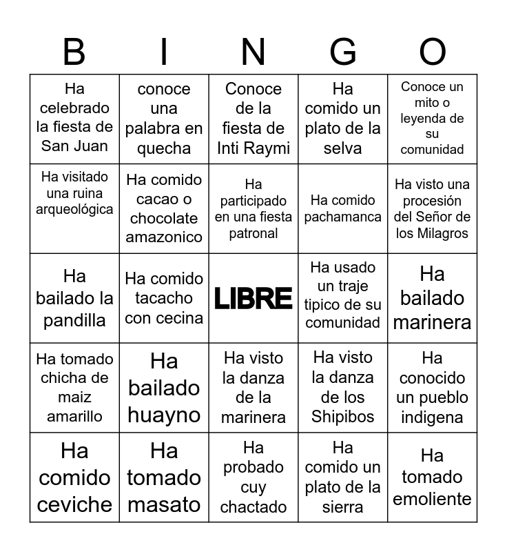This bingo card has a free space and 24 words: Ha comido ceviche, Ha bailado huayno, Ha participado en una fiesta patronal, Ha comido un plato de la sierra, Conoce un mito o leyenda de su comunidad, Ha celebrado la fiesta de San Juan, conoce una palabra en quecha, Conoce de la fiesta de Inti Raymi, Ha usado un traje tipico de su comunidad, Ha bailado marinera, Ha bailado la pandilla, Ha comido cacao o chocolate amazonico, Ha visto la danza de los Shipibos, Ha conocido un pueblo indigena, Ha visitado una ruina arqueológica, Ha tomado masato, Ha probado cuy chactado, Ha comido un plato de la selva, Ha visto una procesión del Señor de los Milagros, Ha tomado chicha de maiz amarillo, Ha comido tacacho con cecina, Ha visto la danza de la marinera, Ha comido pachamanca and Ha tomado emoliente.