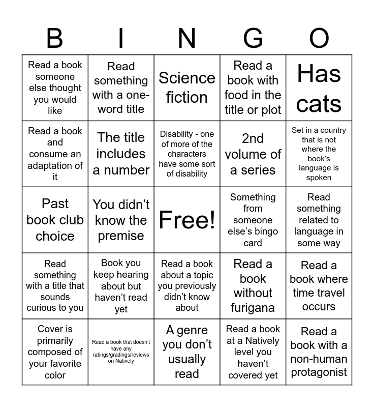 This bingo card has a free space and 24 words: Book you keep hearing about but haven’t read yet, Read a book that doesn’t have any ratings/gradings/reviews on Natively, Disability - one of more of the characters have some sort of disability, Cover is primarily composed of your favorite color, Has cats, Read a book someone else thought you would like, Read a book and consume an adaptation of it, Read something with a one-word title, Something from someone else’s bingo card, Read a book about a topic you previously didn’t know about, 2nd volume of a series, Past book club choice, Read a book without furigana, Read a book where time travel occurs, The title includes a number, Read a book at a Natively level you haven’t covered yet, Read something related to language in some way, Science fiction, Set in a country that is not where the book’s language is spoken, You didn’t know the premise, Read a book with a non-human protagonist, Read something with a title that sounds curious to you, Read a book with food in the title or plot and A genre you don’t usually read.