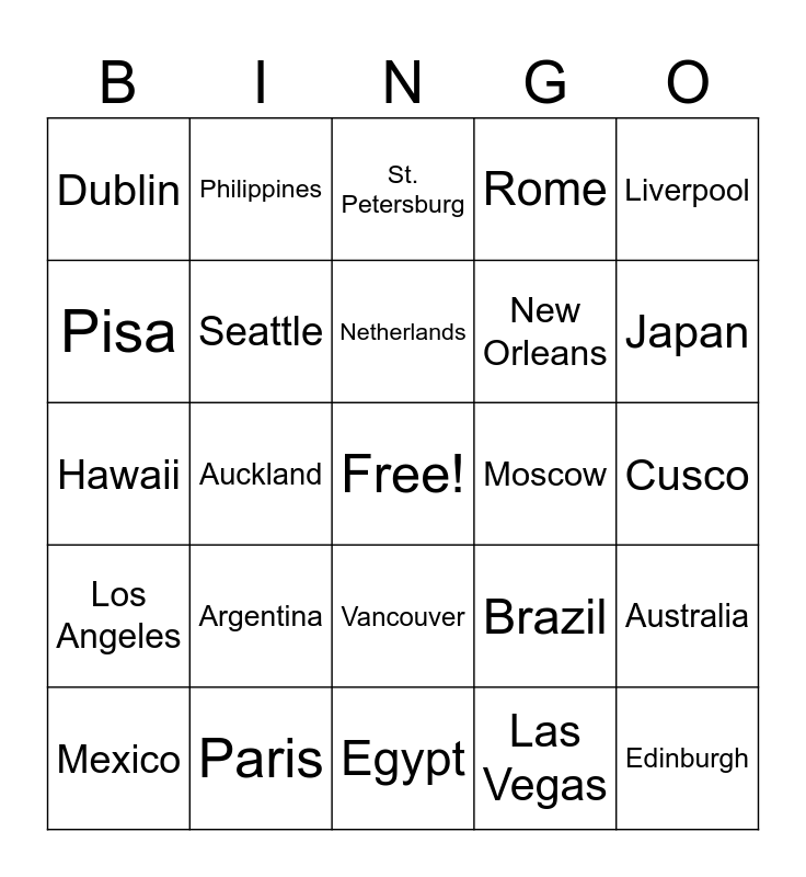 This bingo card has a free space and 60 words: London, Paris, New York City, Los Angeles, Las Vegas, San Francisco, Seattle, Orlando, New Orleans, Philadelphia, Rome, Venice, Pisa, Milan, Zurich, Dublin, Edinburgh, Liverpool, Manchester, Netherlands, Moscow, St. Petersburg, Mexico, Australia, Norway, China, Beijing, Shanghai, Japan, Tokyo, India, Agra, Nepal, Vietnam, Philippines, Sydney, New Zealand, Auckland, Fiji, Hawaii, Rio de Janeiro, Argentina, Cusco, Colombia, Brazil, Canada, Toronto, Quebec City, Edmonton, Vancouver, Egypt, South Africa, Cape Town, Morocco, Tanzania, Barcelona, Spain, Germany, Vienna and Madrid.