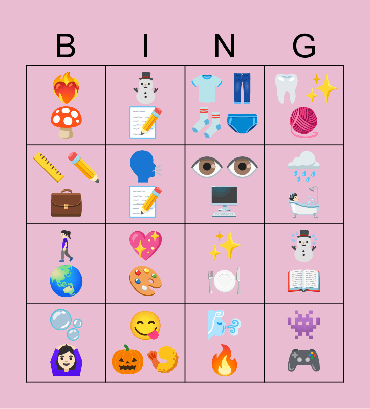 This bingo card has 16 words: ๐ซง๐๐ปโโ๏ธ, ๐ ๐๐ค, ๐๐๐งฆ๐ฉฒ, ๐ฆทโจ๐งถ, ๐โ๏ธ๐ผ, โ๐, โจ๐ฝ๏ธ, โ๏ธ๐, โค๏ธโ๐ฅ๐, ๐ฃ๏ธ๐, ๐ฌ๏ธ๐ฅ, ๐ง๏ธ๐๐ป, ๐ถ๐ปโโ๏ธ๐, ๐๐จ, ๐๏ธ๐๏ธ๐ฅ๏ธ and ๐พ๐ฎ.