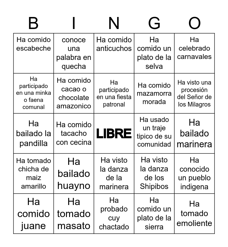 This bingo card has a free space and 24 words: Ha comido juane, Ha bailado huayno, Ha participado en una fiesta patronal, Ha comido un plato de la sierra, Ha celebrado carnavales, Ha comido escabeche, conoce una palabra en quecha, Ha comido anticuchos, Ha usado un traje tipico de su comunidad, Ha bailado marinera, Ha bailado la pandilla, Ha comido cacao o chocolate amazonico, Ha visto la danza de los Shipibos, Ha conocido un pueblo indigena, Ha participado en una minka o faena comunal, Ha tomado masato, Ha probado cuy chactado, Ha comido un plato de la selva, Ha visto una procesión del Señor de los Milagros, Ha tomado chicha de maiz amarillo, Ha comido tacacho con cecina, Ha visto la danza de la marinera, Ha comido mazamorra morada and Ha tomado emoliente.