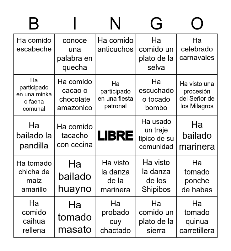 This bingo card has a free space and 24 words: Ha comido caihua rellena, Ha bailado huayno, Ha participado en una fiesta patronal, Ha comido un plato de la sierra, Ha celebrado carnavales, Ha comido escabeche, conoce una palabra en quecha, Ha comido anticuchos, Ha usado un traje tipico de su comunidad, Ha bailado marinera, Ha bailado la pandilla, Ha comido cacao o chocolate amazonico, Ha visto la danza de los Shipibos, Ha tomado ponche de habas, Ha participado en una minka o faena comunal, Ha tomado masato, Ha probado cuy chactado, Ha comido un plato de la selva, Ha visto una procesión del Señor de los Milagros, Ha tomado chicha de maiz amarillo, Ha comido tacacho con cecina, Ha visto la danza de la marinera, Ha escuchado o tocado bombo and Ha tomado quinua carretillera.