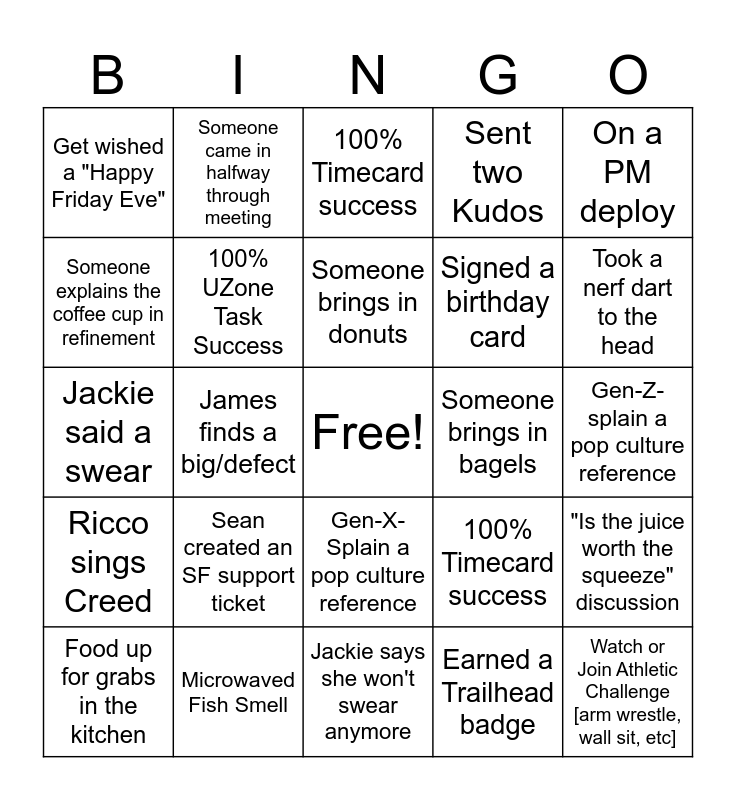 This bingo card has a free space and 28 words: "Is the juice worth the squeeze" discussion, Burnt popcorn smell, Signed a birthday card, Earned a Trailhead badge, Someone explains the coffee cup in refinement, 100% Timecard success, Someone came in halfway through meeting, Ricco sings Creed, Someone brings in bagels, Food up for grabs in the kitchen, Jackie said a swear, Sent two Kudos, Microwaved Fish Smell, Jackie says she won't swear anymore, Took a nerf dart to the head, Shadow a business lane we support, Sean created an SF support ticket, 100% UZone Task Success, Someone brings in donuts, Gen-X-Splain a pop culture reference, Get wished a "Happy Friday Eve", Forced Windows Restart, Watch or Join Athletic Challenge [arm wrestle, wall sit, etc], James finds a big/defect, Gen-Z-splain a pop culture reference, 100% Timecard success, On a PM deploy and Shadow an IT team member.