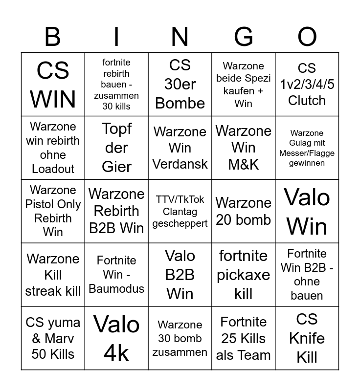 This bingo card has a free space and 24 words: Fortnite Win - Baumodus, Valo 4k, Warzone Win Verdansk, CS yuma & Marv 50 Kills, CS 1v2/3/4/5 Clutch, CS WIN, Warzone win rebirth ohne Loadout, fortnite rebirth bauen - zusammen 30 kills, Warzone 20 bomb, Valo B2B Win, Warzone Win M&K, Warzone Pistol Only Rebirth Win, fortnite pickaxe kill, Fortnite Win B2B - ohne bauen, Topf der Gier, Fortnite 25 Kills als Team, Valo Win, CS 30er Bombe, Warzone Gulag mit Messer/Flagge gewinnen, Warzone Rebirth B2B Win, CS Knife Kill, Warzone Kill streak kill, Warzone beide Spezi kaufen + Win and Warzone 30 bomb zusammen.