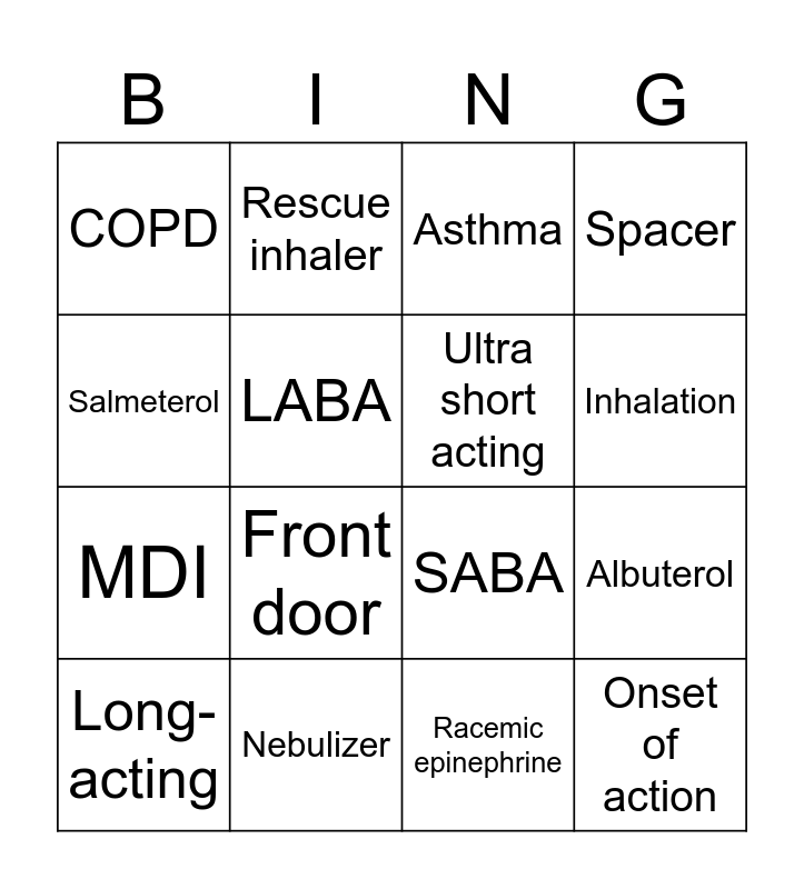 This bingo card has 20 words: Albuterol, Bronchodilation, Asthma, Tachycardia, Long-acting, Salmeterol, Nebulizer, COPD, MDI, Rescue inhaler, Front door, SABA, LABA, Onset of action, Ultra short acting, Xopenex, Inhalation, Spacer, Racemic epinephrine and Beta-2 receptor.