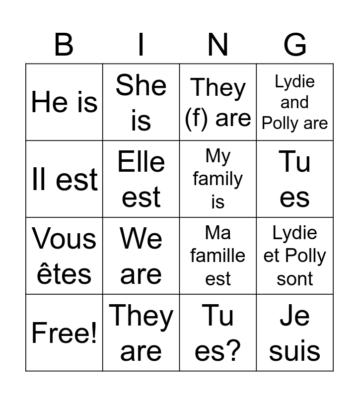 This bingo card has 23 words: Je suis, I am, Tu es, You are, Il est, He is, Elle est, She is, Free!, Nous sommes, We are, Vous êtes, You (pl) are, Ils sont, They are, Elles sont, They (f) are, Ma famille est, My family is, Lydie et Polly sont, Lydie and Polly are, Tu es? and Are you?.