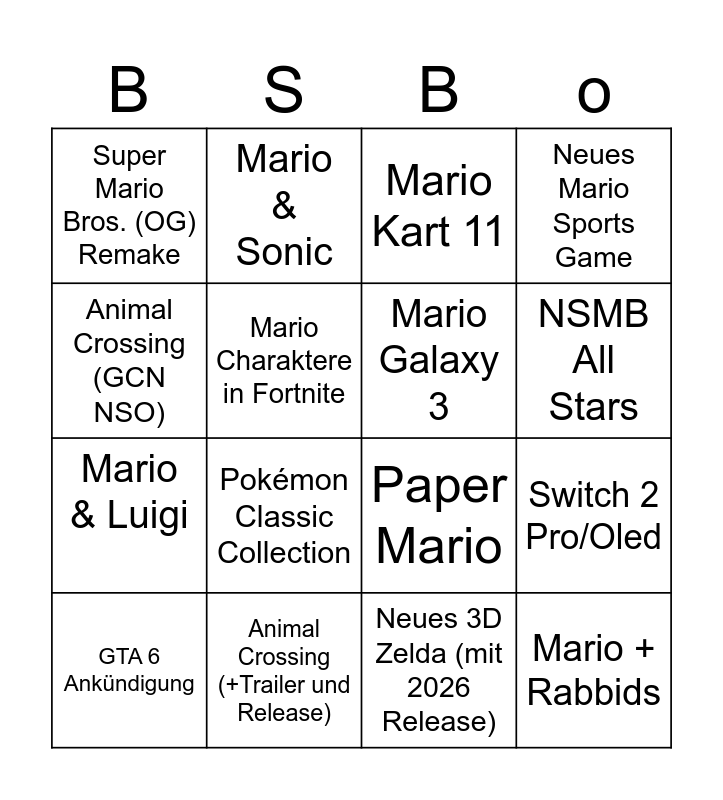 This bingo card has 16 words: Animal Crossing (+Trailer und Release), Switch 2 Pro/Oled, Mario Kart 11, Super Mario Bros. (OG) Remake, Mario & Luigi, Mario & Sonic, Paper Mario, Neues 3D Zelda (mit 2026 Release), Animal Crossing (GCN NSO), Mario Charaktere in Fortnite, GTA 6 Ankündigung, Neues Mario Sports Game, Pokémon Classic Collection, NSMB All Stars, Mario Galaxy 3 and Mario + Rabbids.