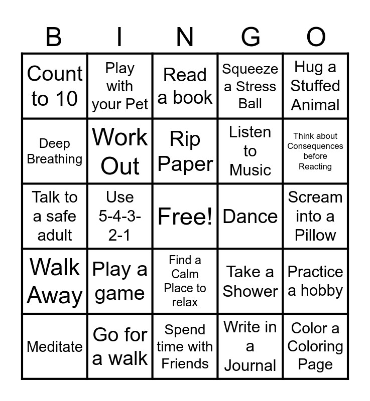 This bingo card has a free space and 24 words: Play a game, Go for a walk, Rip Paper, Meditate, Hug a Stuffed Animal, Count to 10, Deep Breathing, Play with your Pet, Dance, Find a Calm Place to relax, Listen to Music, Talk to a safe adult, Take a Shower, Practice a hobby, Work Out, Write in a Journal, Scream into a Pillow, Read a book, Think about Consequences before Reacting, Use 5-4-3-2-1, Color a Coloring Page, Walk Away, Squeeze a Stress Ball and Spend time with Friends.