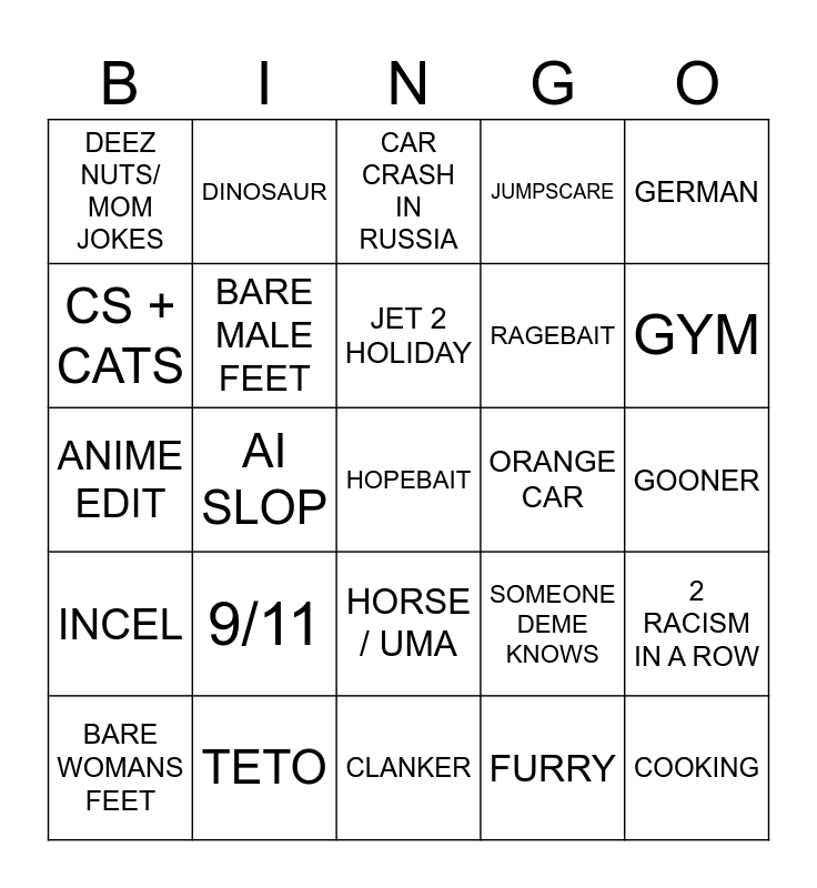 This bingo card has a free space and 24 words: 9/11, TETO, JET 2 HOLIDAY, BARE WOMANS FEET, GERMAN, DEEZ NUTS/ MOM JOKES, CS + CATS, DINOSAUR, ORANGE CAR, HORSE / UMA, RAGEBAIT, ANIME EDIT, SOMEONE DEME KNOWS, 2 RACISM IN A ROW, BARE MALE FEET, FURRY, GOONER, CAR CRASH IN RUSSIA, GYM, AI SLOP, COOKING, INCEL, JUMPSCARE and CLANKER.