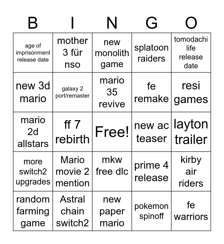 This bingo card has a free space and 24 words: Mario movie 2 mention, Astral chain switch2, mario 35 revive, random farming game, tomodachi life release date, age of imprisonment release date, new 3d mario, mother 3 für nso, new ac teaser, mkw free dlc, fe remake, mario 2d allstars, prime 4 release, kirby air riders, galaxy 2 port/remaster, pokemon spinoff, layton trailer, new monolith game, resi games, ff 7 rebirth, fe warriors, more switch2 upgrades, splatoon raiders and new paper mario.