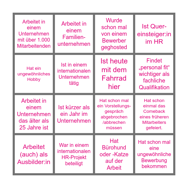 This bingo card has 16 words: War in einem internationalen HR-Projekt beteiligt, Hat schon einmal das Comeback eines früheren Mitarbeiters gefeiert., Wurde schon mal von einem Bewerber geghosted, Arbeitet in einem Unternehmen mit über 1.000 Mitarbeitenden, Arbeitet in einem Unternehmen das älter als 25 Jahre ist, Arbeitet in einem Familien-unternehmen, Hat schon mal ein Vorstellungs-gespräch abgebrochen /abbrechen müssen, Hat Bürohund oder -Katze auf der Arbeit, Hat ein ungewöhnliches Hobby, Ist in einem internationalen Unternehmen tätig, Arbeitet (auch) als Ausbilder:in, Ist Quer-einsteiger:in im HR, Ist kürzer als ein Jahr im Unternehmen, Findet „personal fit“ wichtiger als fachliche Qualifikation, Ist heute mit dem Fahrrad hier and Hat schon mal eine ungewöhnliche Bewerbung bekommen.