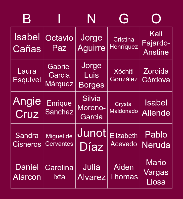 Hispanic Heritage Month Author Bingo | South American/Central American writers | BINGO DE NATAL | Loteria | NAMES