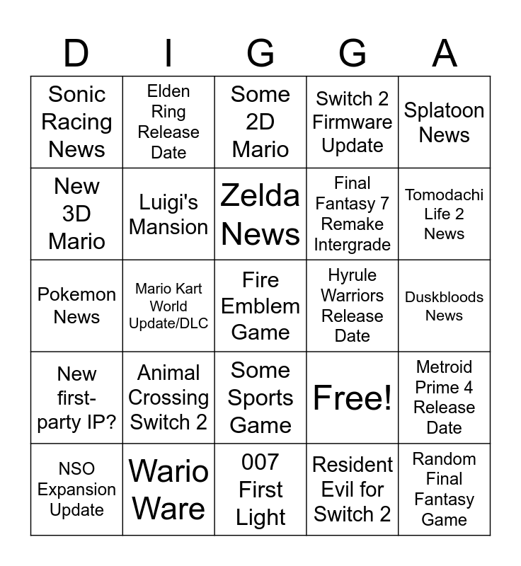 This bingo card has 25 words: Animal Crossing Switch 2, 007 First Light, Zelda News, NSO Expansion Update, Splatoon News, Sonic Racing News, New 3D Mario, Elden Ring Release Date, Hyrule Warriors Release Date, Some Sports Game, Final Fantasy 7 Remake Intergrade, Pokemon News, Free!, Metroid Prime 4 Release Date, Luigi's Mansion, Random Final Fantasy Game, Duskbloods News, Some 2D Mario, Tomodachi Life 2 News, Mario Kart World Update/DLC, Fire Emblem Game, Wario Ware, New first-party IP?, Switch 2 Firmware Update and Resident Evil for Switch 2.