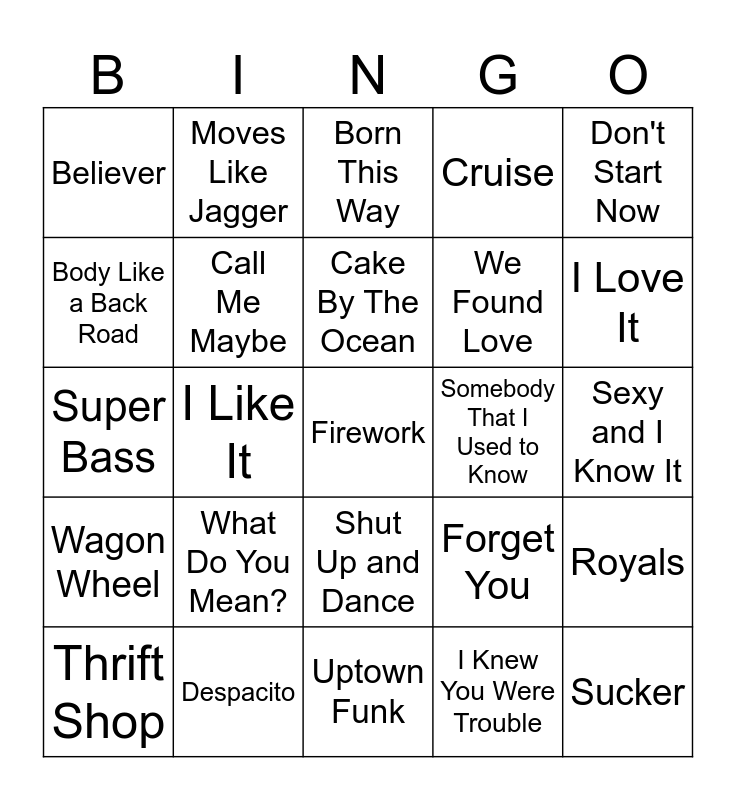 This bingo card has 36 words: Rolling in the Deep, Wake Me Up, bad guy, Call Me Maybe, Forget You, Wagon Wheel, Cake By The Ocean, Hotline Bling, Don't Start Now, Shape of You, I Like It, Cruise, We Are Young, Somebody That I Used to Know, I Love It, Believer, Sucker, What Do You Mean?, Firework, Born This Way, Sexy and I Know It, Royals, Despacito, Thrift Shop, Uptown Funk, Moves Like Jagger, Super Bass, What Makes You Beautiful, We Found Love, Body Like a Back Road, Stay With Me, Cheap Thrills, I Knew You Were Trouble, Shut Up and Dance, Can't Feel My Face and The Middle.