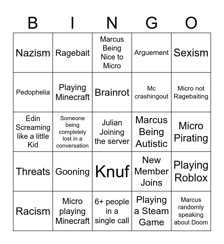 This bingo card has a free space and 24 words: Gooning, Micro playing Minecraft, Brainrot, Racism, Sexism, Nazism, Pedophelia, Ragebait, Marcus Being Autistic, Knuf, Mc crashingout, Edin Screaming like a little Kid, New Member Joins, Playing Roblox, Playing Minecraft, Playing a Steam Game, Micro Pirating, Marcus Being Nice to Micro, Micro not Ragebaiting, Someone being completely lost in a conversation, Marcus randomly speaking about Doom, Threats, Arguement and 6+ people in a single call.
