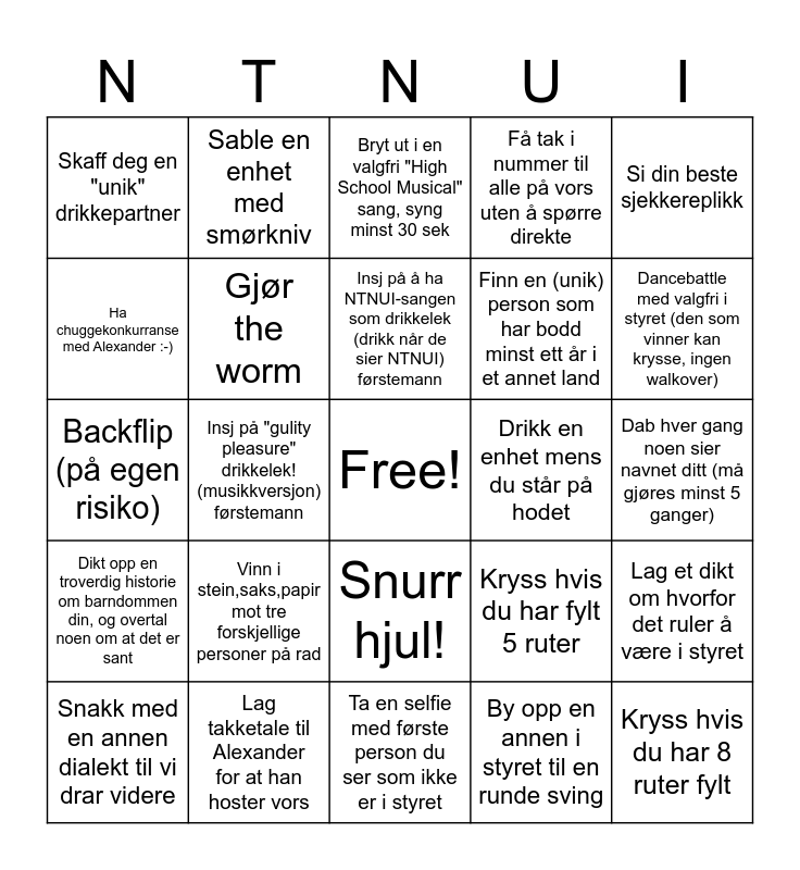 This bingo card has a free space and 24 words: Vinn i stein,saks,papir mot tre forskjellige personer på rad, Lag takketale til Alexander for at han hoster vors, Insj på å ha NTNUI-sangen som drikkelek (drikk når de sier NTNUI) førstemann, Snakk med en annen dialekt til vi drar videre, Si din beste sjekkereplikk, Skaff deg en "unik" drikkepartner, Ha chuggekonkurranse med Alexander :-), Sable en enhet med smørkniv, Drikk en enhet mens du står på hodet, Snurr hjul!, Finn en (unik) person som har bodd minst ett år i et annet land, Backflip (på egen risiko), Kryss hvis du har fylt 5 ruter, Lag et dikt om hvorfor det ruler å være i styret, Gjør the worm, By opp en annen i styret til en runde sving, Dab hver gang noen sier navnet ditt (må gjøres minst 5 ganger), Bryt ut i en valgfri "High School Musical" sang, syng minst 30 sek, Dancebattle med valgfri i styret (den som vinner kan krysse, ingen walkover), Insj på "gulity pleasure" drikkelek! (musikkversjon) førstemann, Kryss hvis du har 8 ruter fylt, Dikt opp en troverdig historie om barndommen din, og overtal noen om at det er sant, Få tak i nummer til alle på vors uten å spørre direkte and Ta en selfie med første person du ser som ikke er i styret.