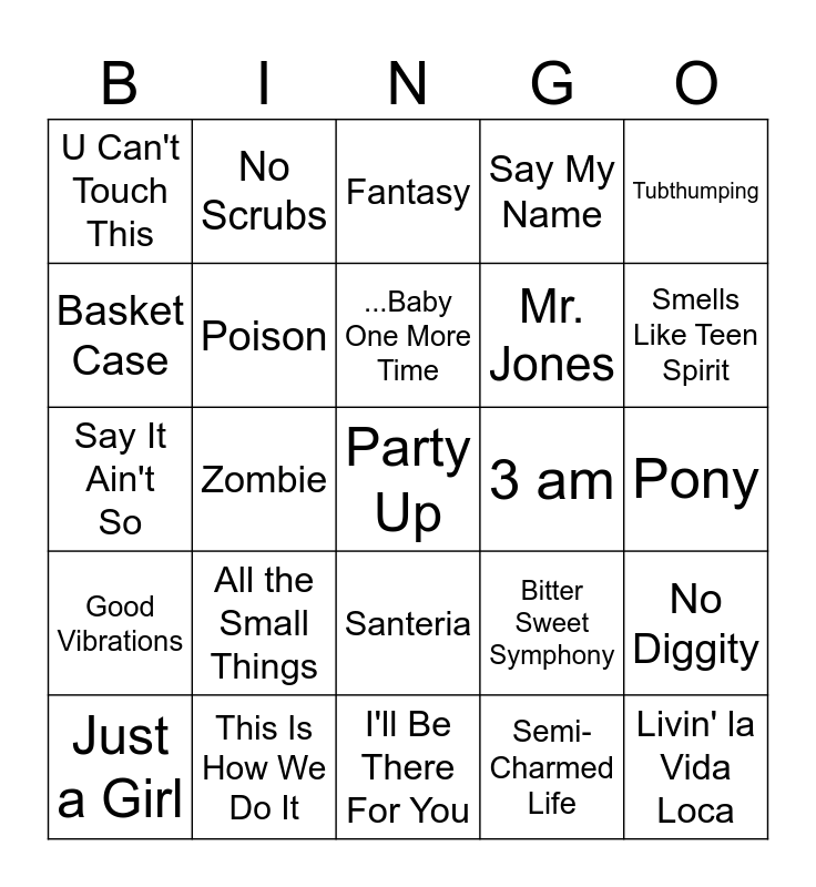 This bingo card has 38 words: Barbie Girl, I Want It That Way, Intergalactic, Poison, No Diggity, All the Small Things, ...Baby One More Time, My Heart Will Go On, Tubthumping, Mr. Jones, Zombie, Say My Name, Party Up, Pony, Basket Case, Good Vibrations, My Own Worst Enemy, Fantasy, Return of the Mack, 3 am, U Can't Touch This, This Is How We Do It, Smells Like Teen Spirit, Just a Girl, Hypnotize, I'll Be There For You, Livin' la Vida Loca, Man! I Feel Like a Woman!, Baby-Got-Back, All Star, Wannabe, Santeria, Semi-Charmed Life, No Scrubs, I Will Always Love You, Bitter Sweet Symphony, Say It Ain't So and California Love.