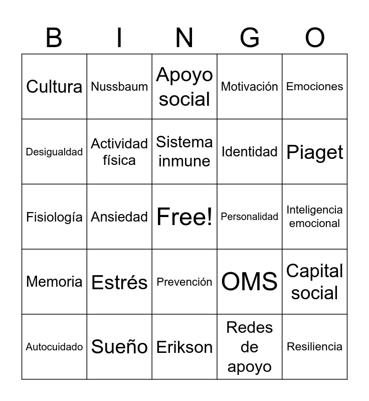 This bingo card has a free space and 40 words: Genética, Fisiología, Nutrición, Actividad física, Sueño, Prevención, Sistema inmune, Enfermedad, Emociones, Memoria, Ansiedad, Motivación, Resiliencia, Inteligencia emocional, Personalidad, Estrés, Familia, Cultura, Comunidad, Apoyo social, Capital social, Redes de apoyo, Identidad, Desigualdad, Bienestar, Salud integral, Determinantes sociales, Desarrollo humano, Modelo biopsicosocial, Inclusión, Equidad, Autocuidado, Engel, OMS, Piaget, Erikson, Goleman, Bronfenbrenner, Nussbaum and Sen.