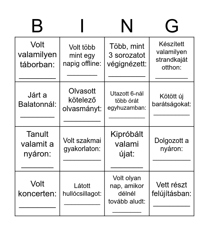 This bingo card has 20 words: Dolgozott a nyáron: __________, Vigyázott kisállatra vagy kistesóra: _________, Több, mint 3 sorozatot végignézett: _________, Új piercingje / tetoválása / frizurája lett: ________, Volt koncerten: ________, Járt a Balatonnál: ________, Látott hullócsillagot: __________, Volt valamilyen táborban: ________, Tanult valamit a nyáron: _______, Volt több mint egy napig offline: ________, Volt szakmai gyakorlaton: __________, Kipróbált valami újat: _______, Olvasott kötelező olvasmányt: _________, Vett részt felújításban: _________, Utazott 6-nál több órát egyhuzamban: ___________, Aludt sátorban vagy függőágyban: ________, Kötött új barátságokat: __________, Készített valamilyen strandkaját otthon: _________, Volt olyan nap, amikor délnél tovább aludt: ________ and Felfedezett egy új helyet a városban vagy a környéken: __________.