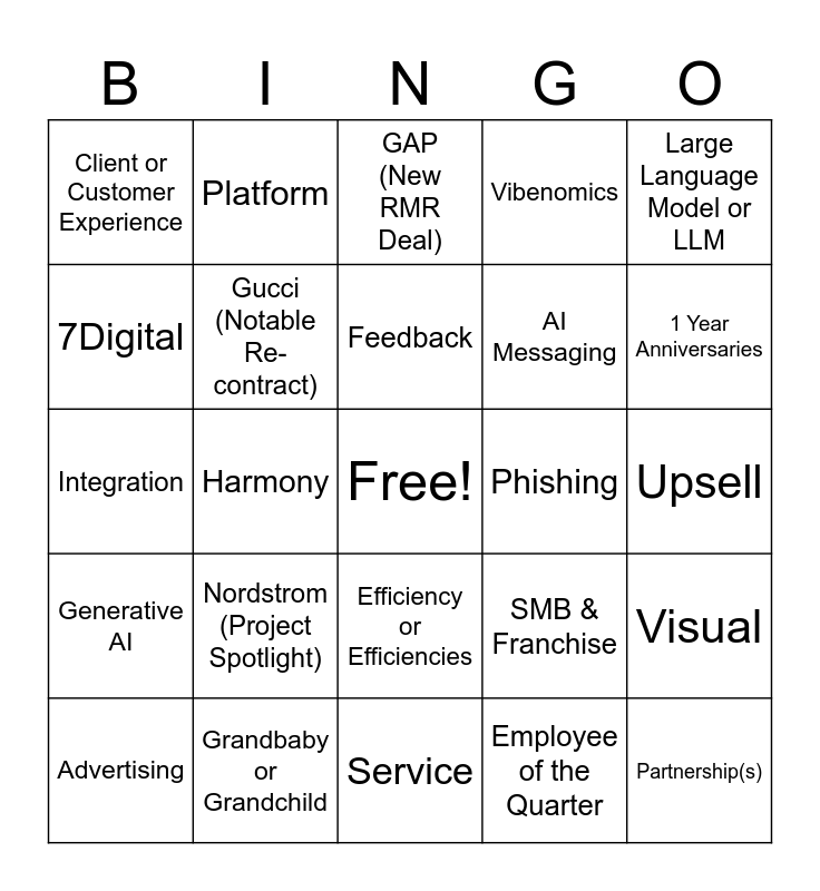This bingo card has a free space and 29 words: Advertising, ISM or (In-Store Marketplace), Harmony, AI or Artificial Intelligence, Client or Customer Experience, GAP (New RMR Deal), Gucci (Notable Re-contract), Nordstrom (Project Spotlight), Phishing, Grandbaby or Grandchild, Upsell, Partnership(s), Service, Employee of the Quarter, 1 Year Anniversaries, Gemini, Efficiency or Efficiencies, Generative AI, Large Language Model or LLM, Integration, SMB & Franchise, Co-Pilot, AI Messaging, 7Digital, Vibenomics, Platform, Visual, Feedback and Future Store(s).