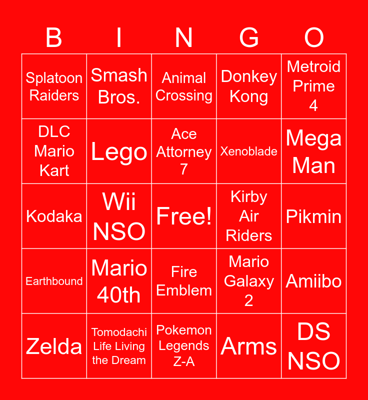 This bingo card has a free space and 24 words: Mario 40th, Tomodachi Life Living the Dream, Ace Attorney 7, Zelda, Metroid Prime 4, Splatoon Raiders, DLC Mario Kart, Smash Bros., Kirby Air Riders, Fire Emblem, Xenoblade, Kodaka, Mario Galaxy 2, Amiibo, Lego, Arms, Pikmin, Animal Crossing, Mega Man, Wii NSO, DS NSO, Earthbound, Donkey Kong and Pokemon Legends Z-A.
