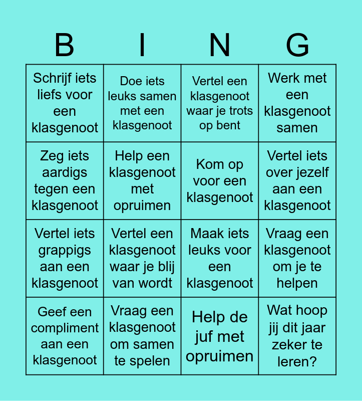 This bingo card has 17 words: Geef een compliment aan een klasgenoot, Vraag een klasgenoot om samen te spelen, Vertel een klasgenoot waar je trots op bent, Werk met een klasgenoot samen, Vertel iets grappigs aan een klasgenoot, Help een klasgenoot met opruimen, Maak iets leuks voor een klasgenoot, Vertel iets over jezelf aan een klasgenoot, Zeg iets aardigs tegen een klasgenoot, Vertel een klasgenoot waar je blij van wordt, Help de juf met opruimen, Vraag een klasgenoot om je te helpen, Schrijf iets liefs voor een klasgenoot, Doe iets leuks samen met een klasgenoot, Kom op voor een klasgenoot, Wat hoop jij dit jaar zeker te leren? and Help een klasgenoot bij zijn opdracht.