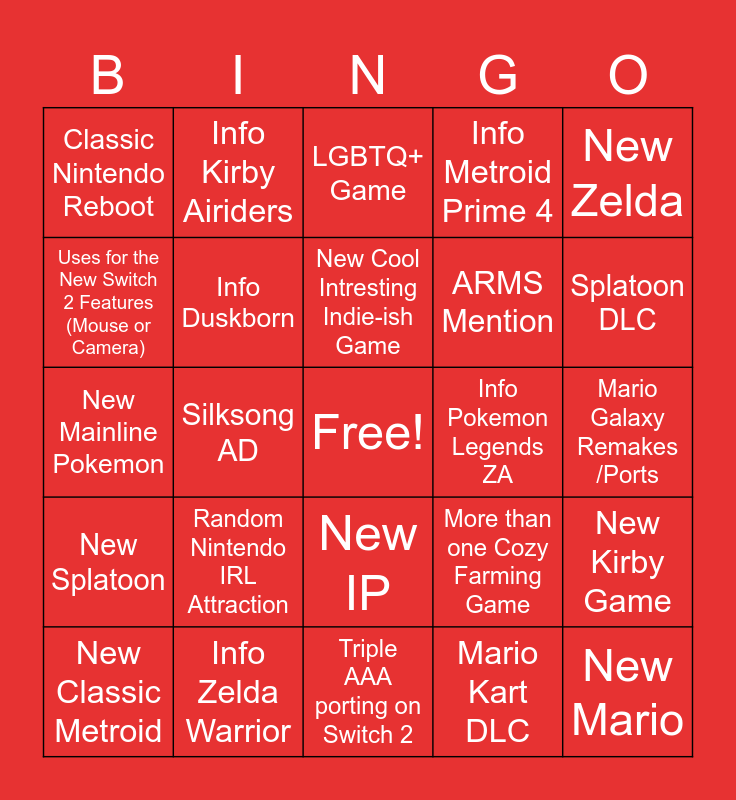This bingo card has a free space and 24 words: New Classic Metroid, Random Nintendo IRL Attraction, New Cool Intresting Indie-ish Game, Mario Kart DLC, New Zelda, Classic Nintendo Reboot, Info Kirby Airiders, LGBTQ+ Game, Info Pokemon Legends ZA, Mario Galaxy Remakes /Ports, New Mainline Pokemon, Info Duskborn, More than one Cozy Farming Game, New Kirby Game, Uses for the New Switch 2 Features (Mouse or Camera), Info Zelda Warrior, Triple AAA porting on Switch 2, Info Metroid Prime 4, Splatoon DLC, New Splatoon, Silksong AD, New IP, ARMS Mention and New Mario.