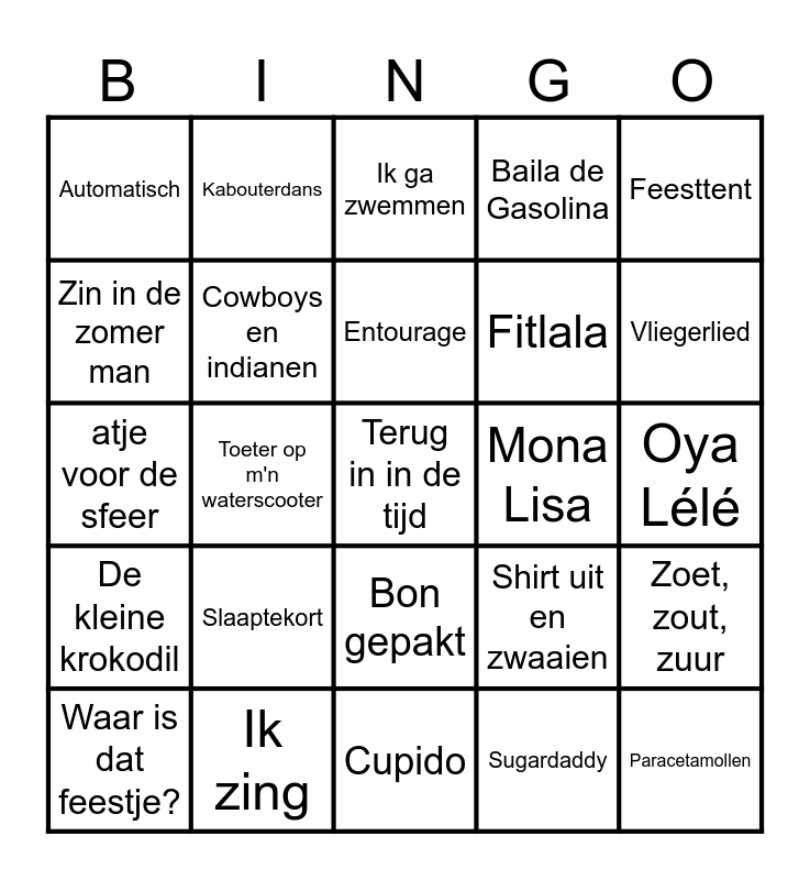 This bingo card has 42 words: Free!, Entourage, Alles op gevoel, Slaaptekort, Sugardaddy, Zoet, zout, zuur, Terug in in de tijd, Engelbewaarder, Ik ga zwemmen, Bon gepakt, Oya Lélé, Vliegerlied, Toeter op m'n waterscooter, Feesttent, Vogeltjesdans, Shirt uit en zwaaien, Links, rechts, atje voor de sfeer, Europapa, Kabouterdans, Zin in de zomer man, overkant, Paracetamollen, Automatisch, Pasapas, Daba die daba daa, Fitlala, Hoofd schouders knie en teen, Dromendans, Macarena, Sexy als ik dans, De kleine krokodil, Cowboys en indianen, Cupido, Leef, Waar is dat feestje?, Ik zing, Mona Lisa, Lotje, Nachtenlang, Baila de Gasolina and Echte liefde is te koop.