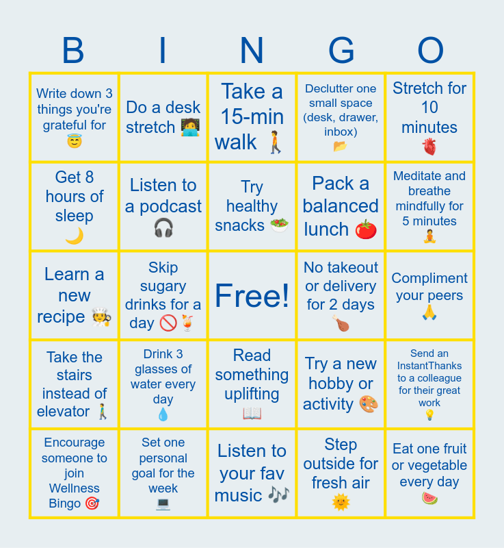 This bingo card has a free space and 24 words: Drink 3 glasses of water every day π§, Set one personal goal for the week π», Try healthy snacks π₯, Encourage someone to join Wellness Bingo π―, Stretch for 10 minutes π«, Write down 3 things you're grateful forπ, Get 8 hours of sleep π, Do a desk stretch π§βπ», No takeout or delivery for 2 days π, Read something uplifting π, Pack a balanced lunch π , Learn a new recipe π§βπ³, Try a new hobby or activity π¨, Send an InstantThanks to a colleague for their great work π‘, Listen to a podcast π§, Step outside for fresh air π, Compliment your peers π, Take a 15-min walk πΆ, Meditate and breathe mindfully for 5 minutes π§, Skip sugary drinks for a day π«πΉ, Eat one fruit or vegetable every day π, Take the stairs instead of elevator πΆββοΈ, Declutter one small space (desk, drawer, inbox) π and Listen to your fav music πΆ.